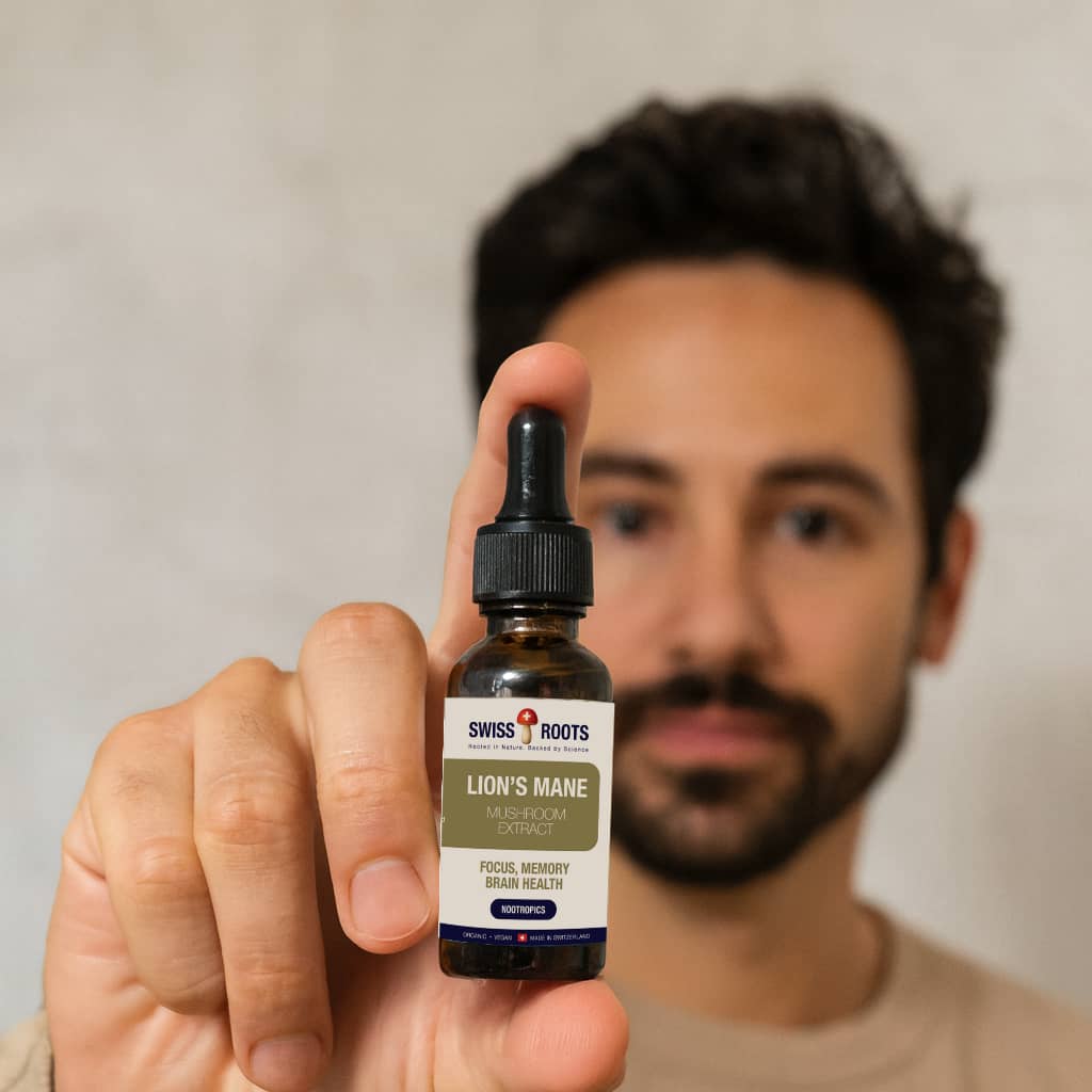 Swiss Roots Lion’s Mane™ mushroom extract is a natural nootropic, formulated to support focus, memory, and overall cognitive function. Made in Switzerland, this concentrated extract is derived from the fruiting body of the Lion’s Mane mushroom using a potent 20:1 ratio, equivalent to 4,000 mg of dried mushrooms per 1 ml. Rooted in nature and backed by science, this supplement offers daily support for mental performance.